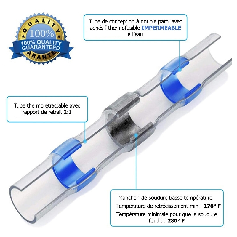 Entièrement étanche IP67, le tube isolant a une conception unique à double paroi pour procéder au raccordement des câbles en une seule étape :