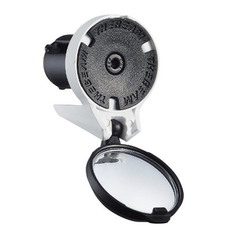 En complément d’une sonnette vélo, ce petit accessoire de sécurité pour embout de cintre permet d’offrir un champ visuel à 360° et jusqu’à 100 mètres de distance grâce à un miroir en polycarbonate de 32 mm de diamètre.