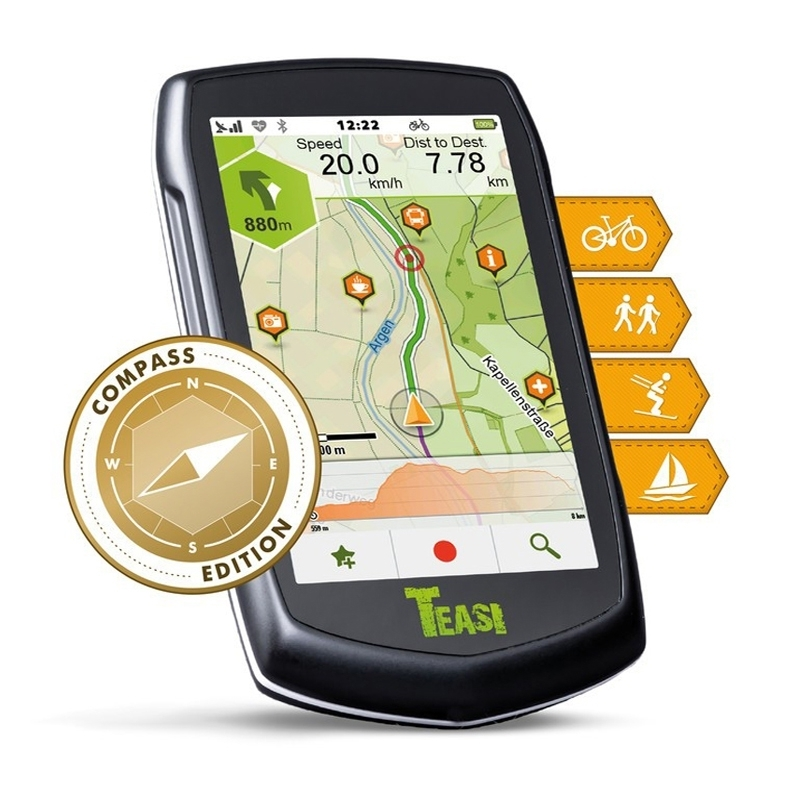 Les amis de plein air arrivent confortablement à leur destination en utilisant le GPS Teasi ONE3. Aussi bien à terre que sur l’eau et la neige. TEASI ONE3 est conçu pour les cyclistes, les randonneurs, les skieurs et ceux qui se promennent en bateau. Il vous guide facilement et avec fiabilité dans tous les pays européens. En plus, il est doté d’une boussole 3D, utilisé pour la randonnée à pied ou Geocaching.