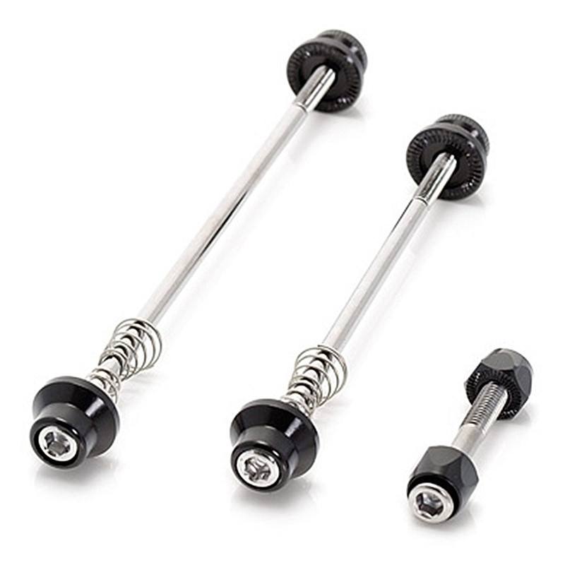 Fabriqué en acier et en aluminium de couleur noir et chrome, L’axe pour la roue avant à une longueur de 110 mm et l’axe pour la roue arrière mesure 135 mm de long pour un dimaètre de 5 mm et pour un poids de seulement 66 g.