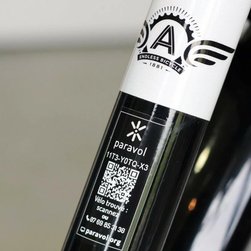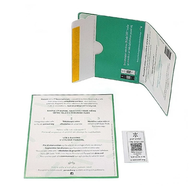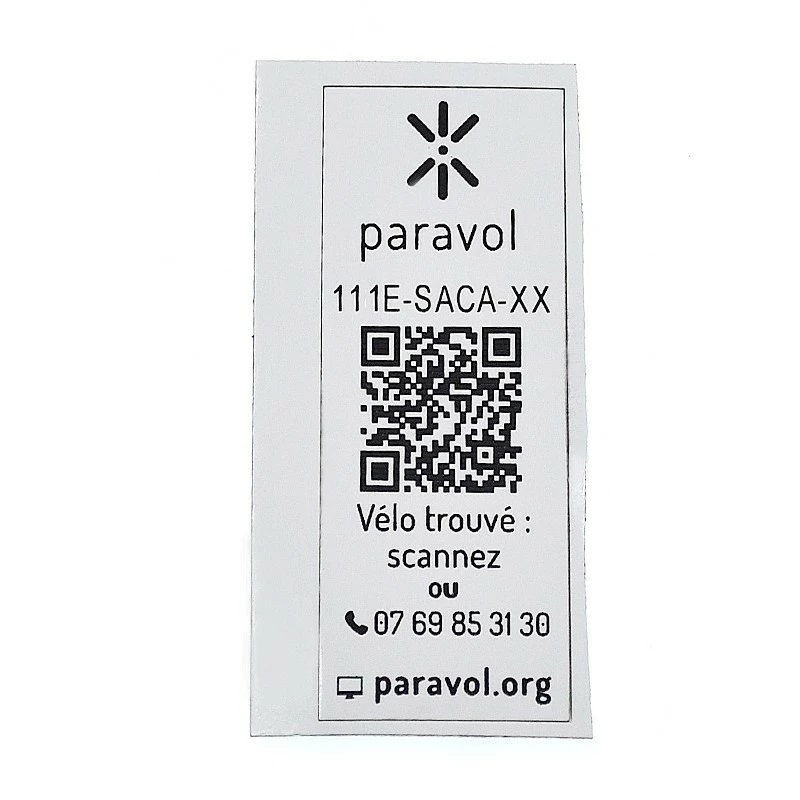 L’ensemble de l’achat comprend une enveloppe cartonnée avec à l’intérieur un sticker QR code de haute qualité, résistant à l’eau et à l’arrachage. celui-ci est à coller sur le cadre du vélo avec son code d’activation, et à valider sur le site Paravol.org.
