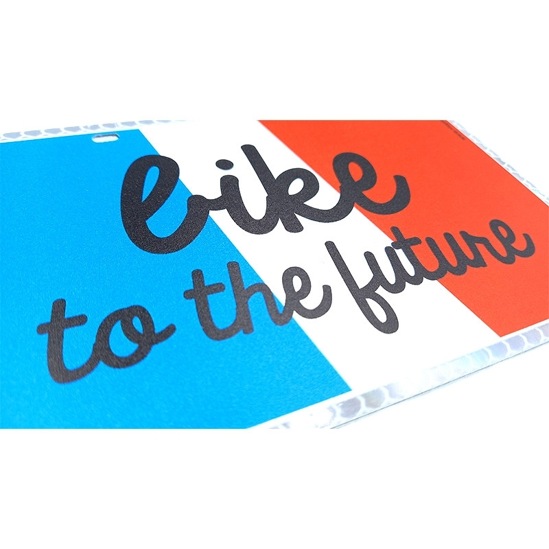 La plaque Bike to the Future tricolore se positionne facilement sous la selle grâce aux 2 attaches anti-vandales. Cet accessoire original de fabrication Française est rétro-réfléchissant et et colorée en bleu-blanc-rouge.