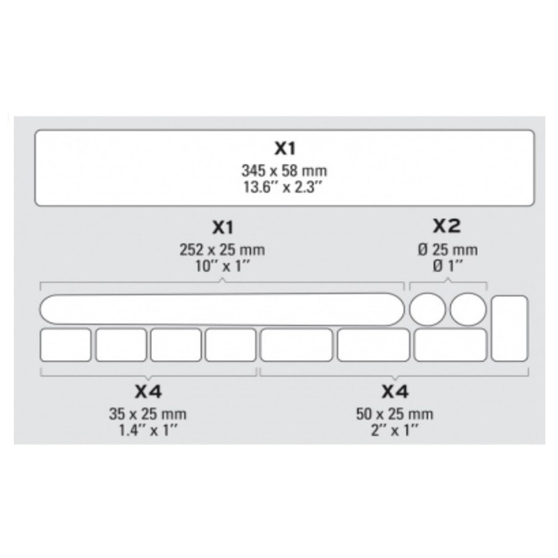 - 12 patchs : 1 protection de tube diagonal (345 x 58 mm), 1 protection de base arrière (252 x 25 mm), 4 patchs 35 x 25 mm, 4 patchs 50 x 25 mm, 2 patchs