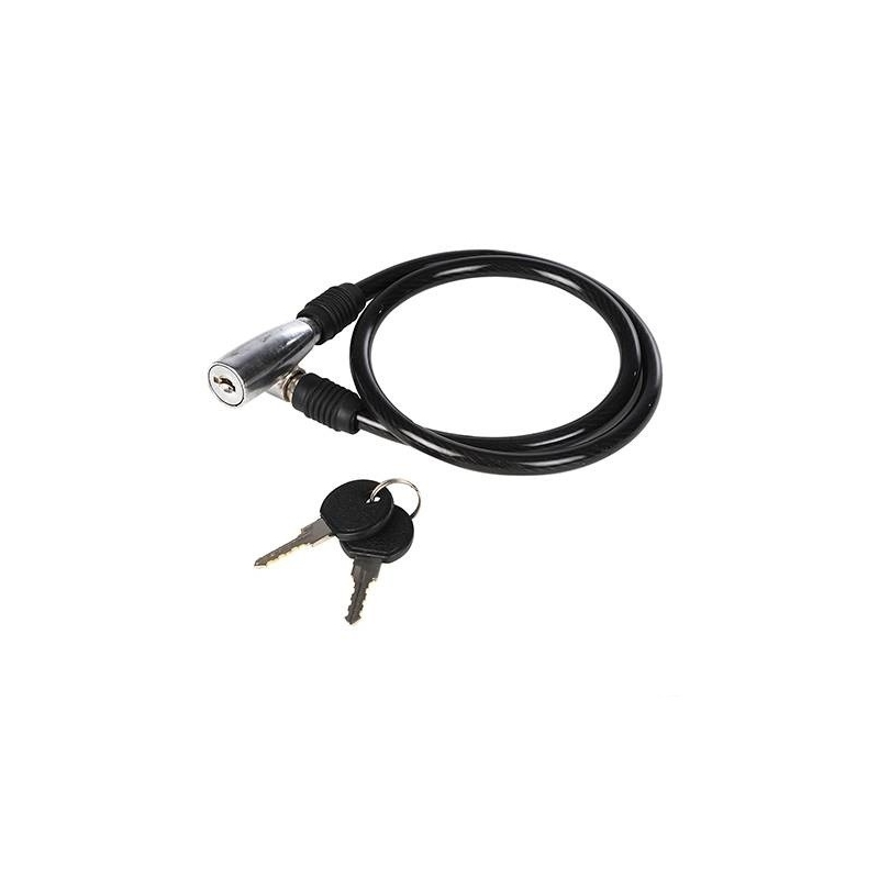 Câble spiralé flexible en acier avec serrure à clé. La gaine PVC protège la peinture du vélo. Fourni avec 2 clés.