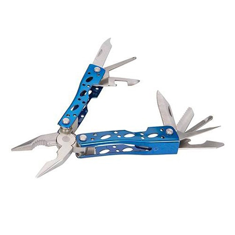 Outil multifonction compact en acier inoxydable. Comprend : pince, tournevis cruciforme, lame dentée, poinçon et lime.