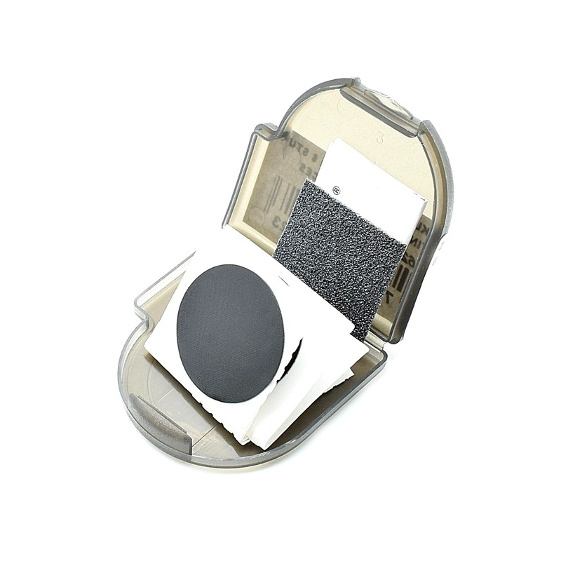 L’ensemble est vendu dans une petite boite en plastique noir avec 6 rustines auto-adhésives et 1 râpe.