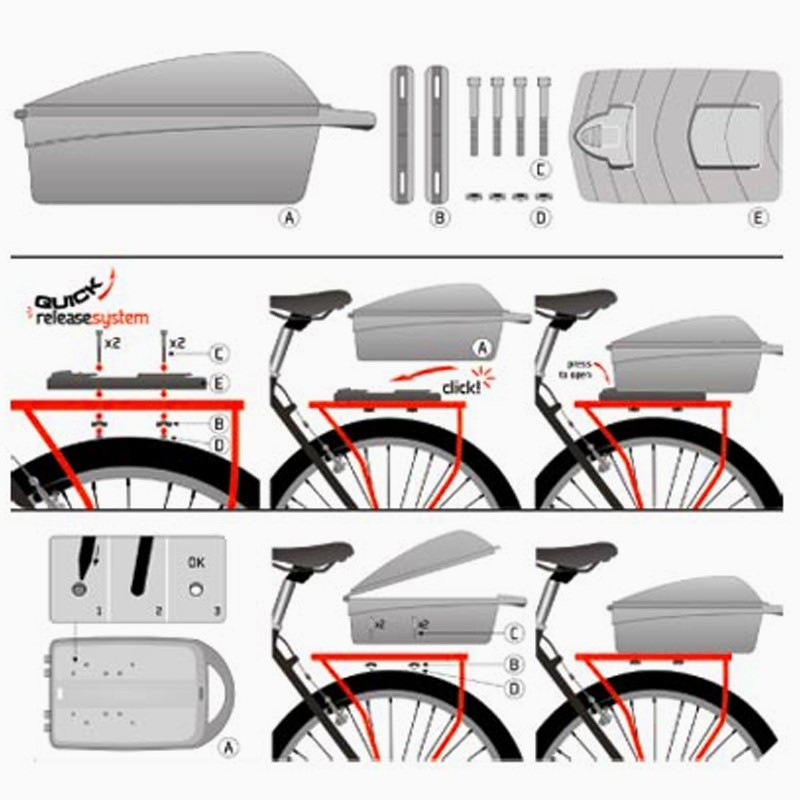 Ce coffre de vélo se fixe à l’aide de son système de fixation QUICK RELEASE sur le porte bagage arrière du vélo. Le top case dispose d’un volume de 12 litres pour y ranger toutes ses affaires personnelles. La conception du coffre permet de le transporter facilement puisqu’il possède une poignée intégré.