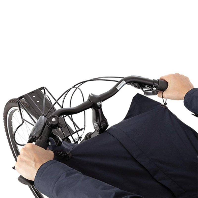 - Anneaux élastiques accrochables aux pouces/au guidon pour tendre la cape/le couvre-jambes, extractibles des poches basses