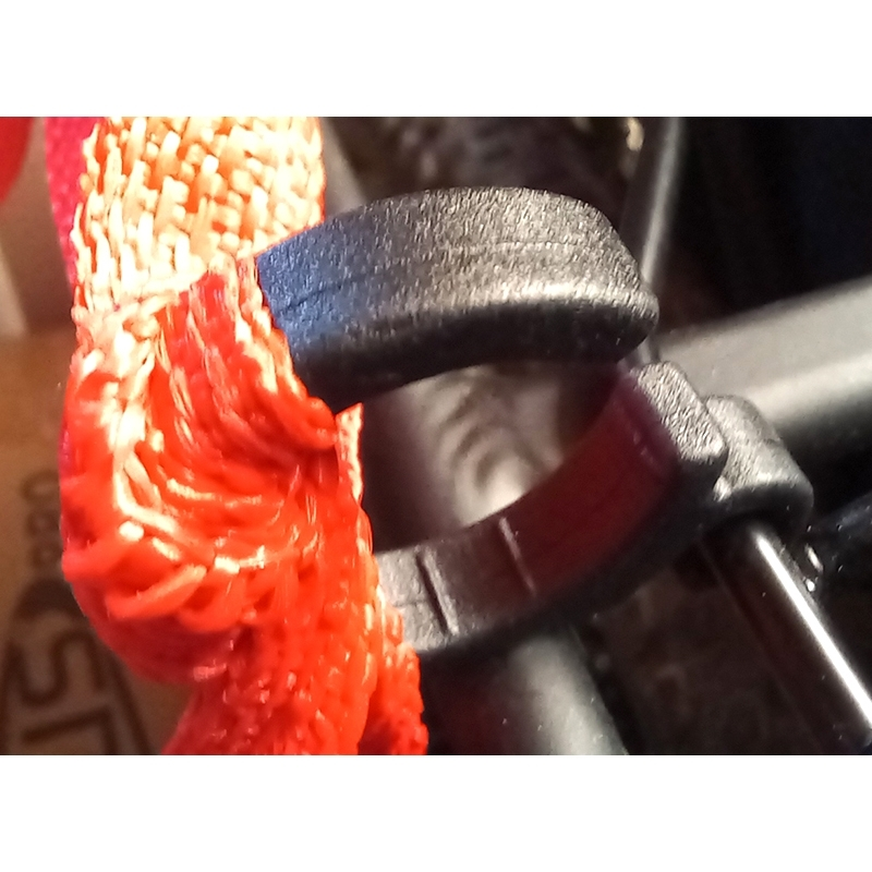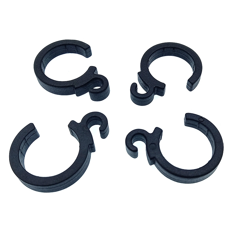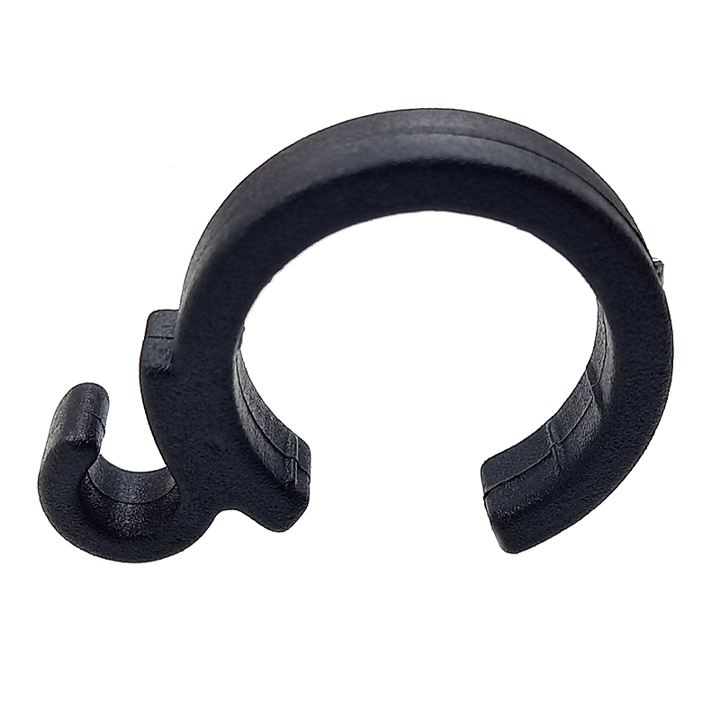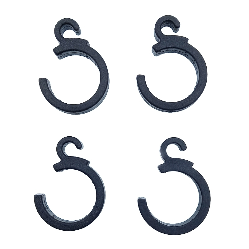 Fabriqué en plastique robuste noir, le crochet comporte une boucle large pour le maintien des sacs et d’une petite boucle à clipser sur les tubes de 6 mm de diamètre.