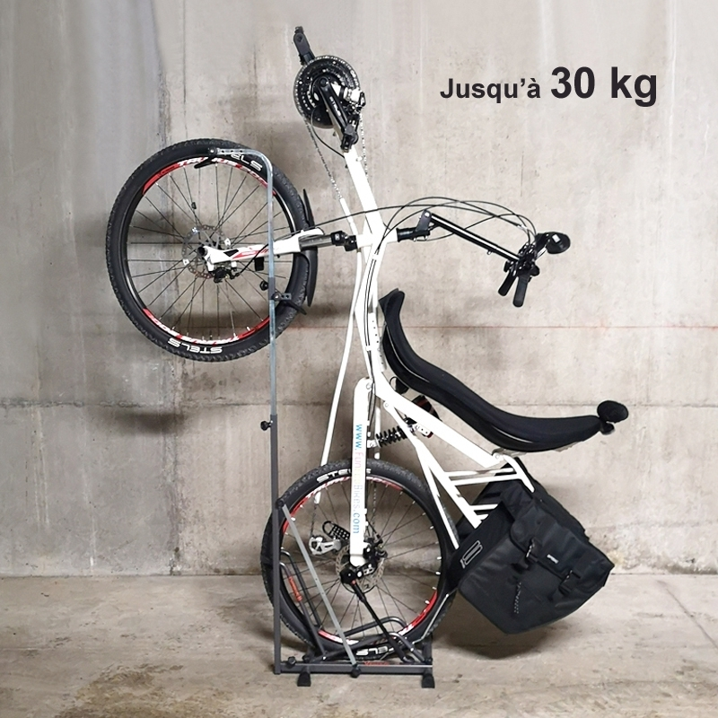Ce type de rangement pour bicyclette en position verticale permet de ranger des vélos de type : VTT, VTC, Beach Cruiser, Vélo enfant, Vélo couché à 2 roues … pour un poids jusqu’à 30 kg (Voir nos photos en condition réelles).